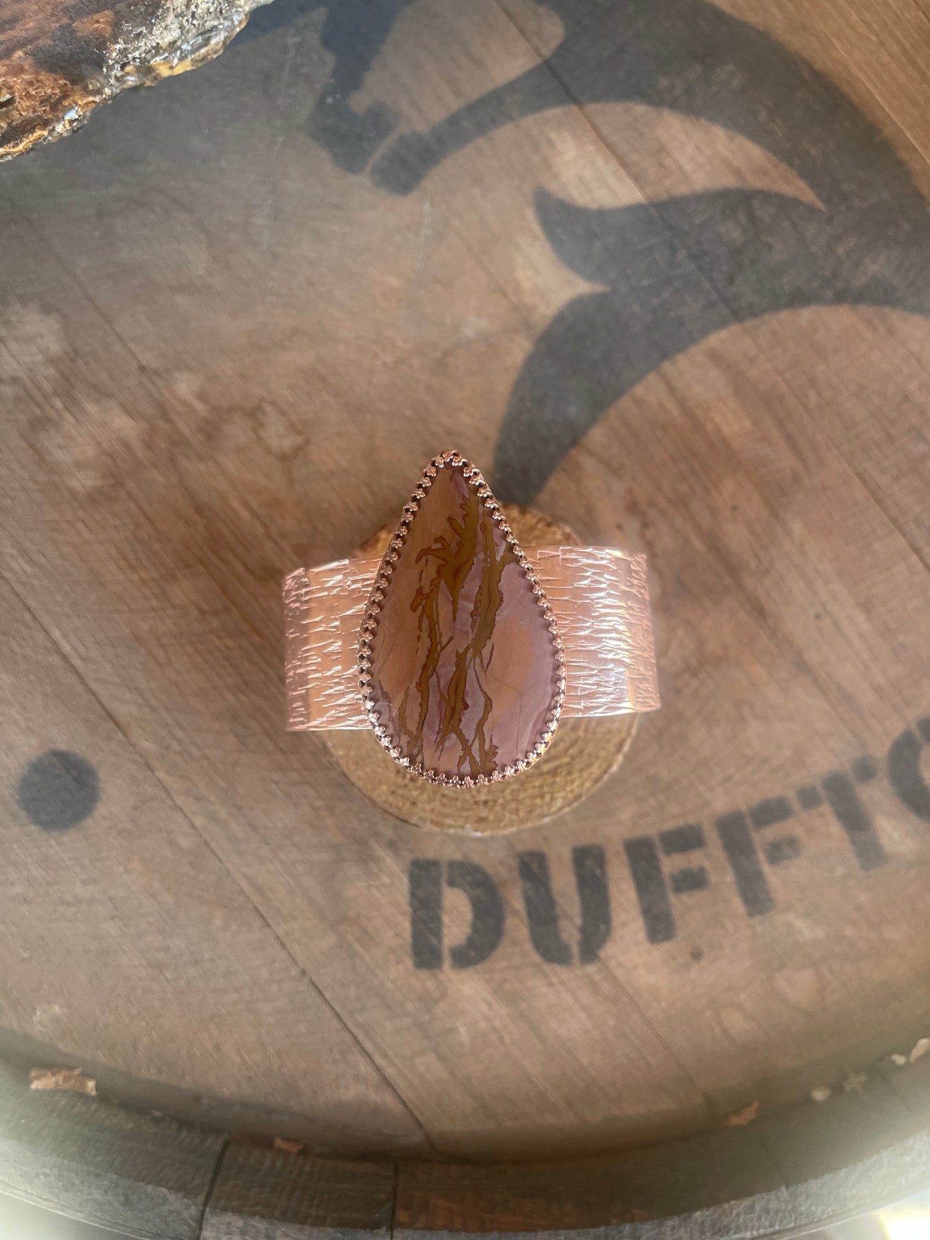 You will never see another stone as pretty as this! Purple, brown, and copper tones in the stone. Set on a one inch wide copper band, 6 inches long. Hammered texture band.
