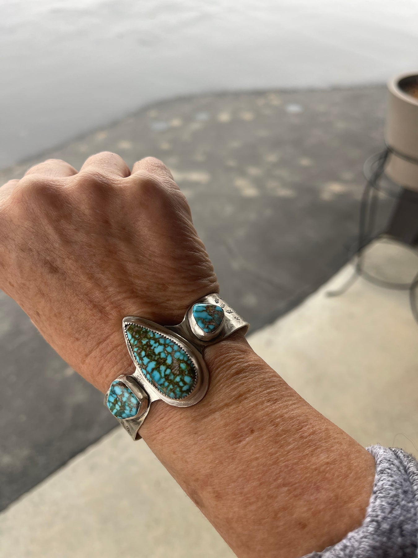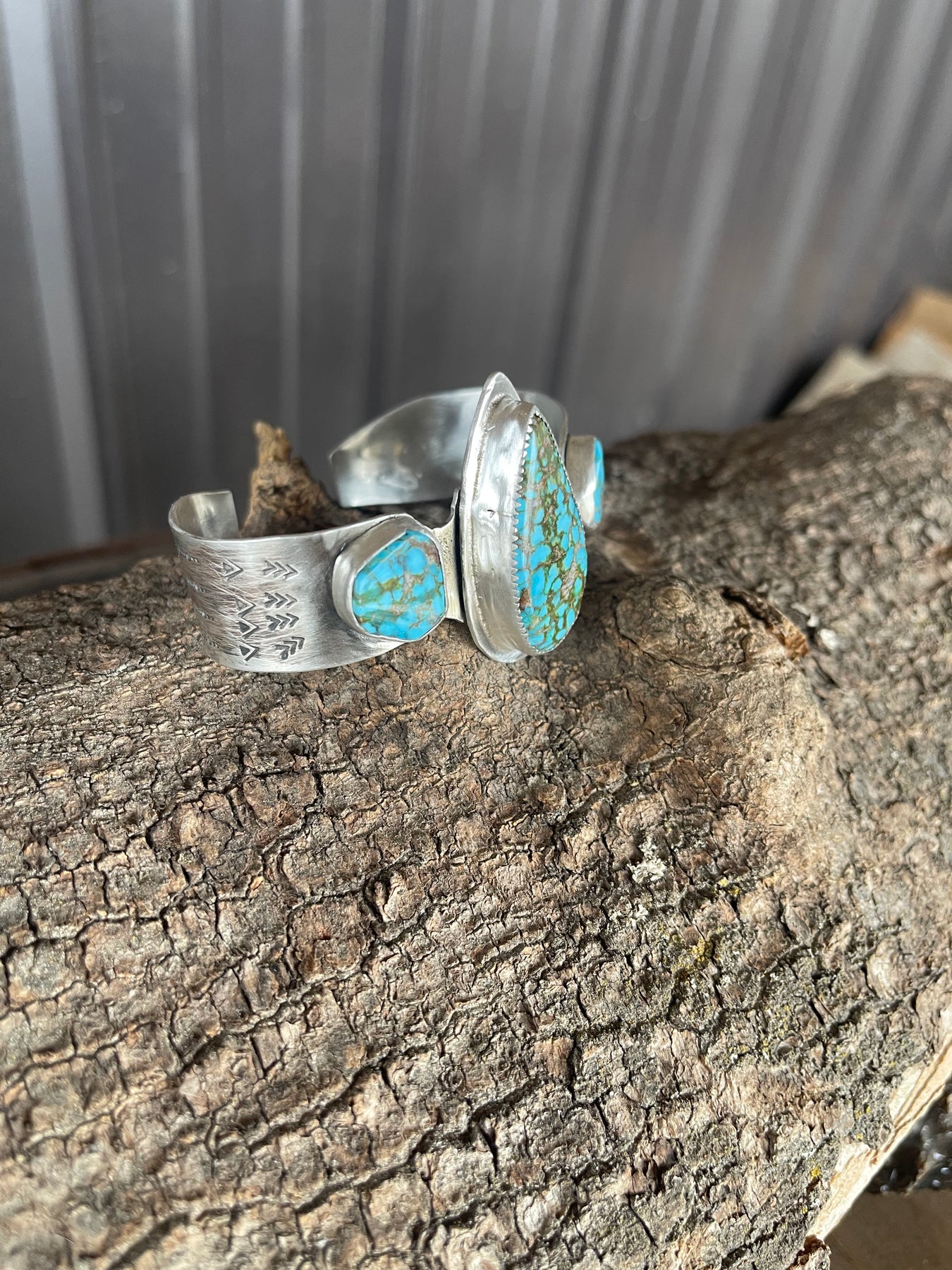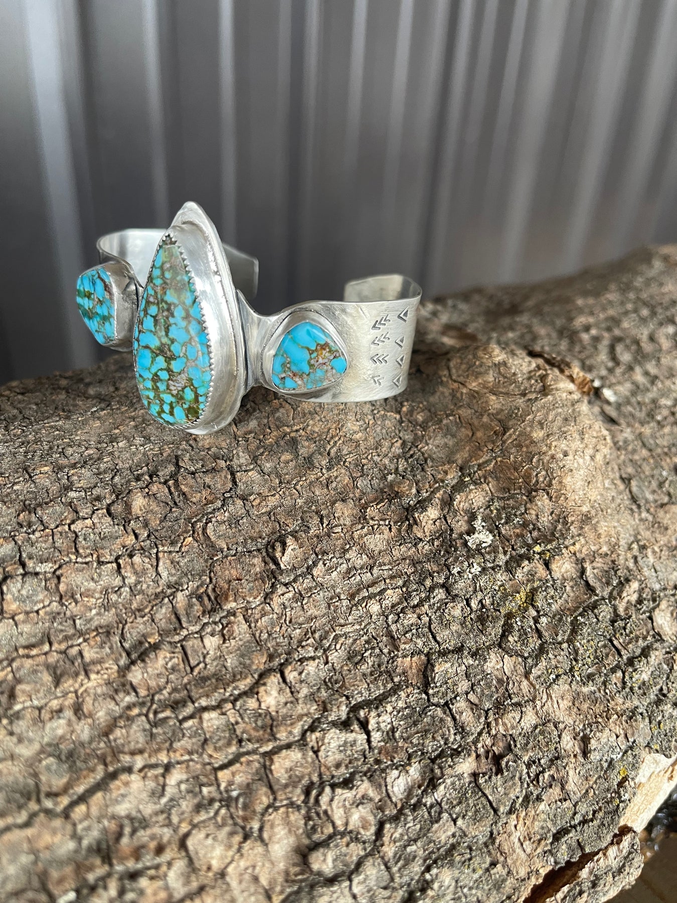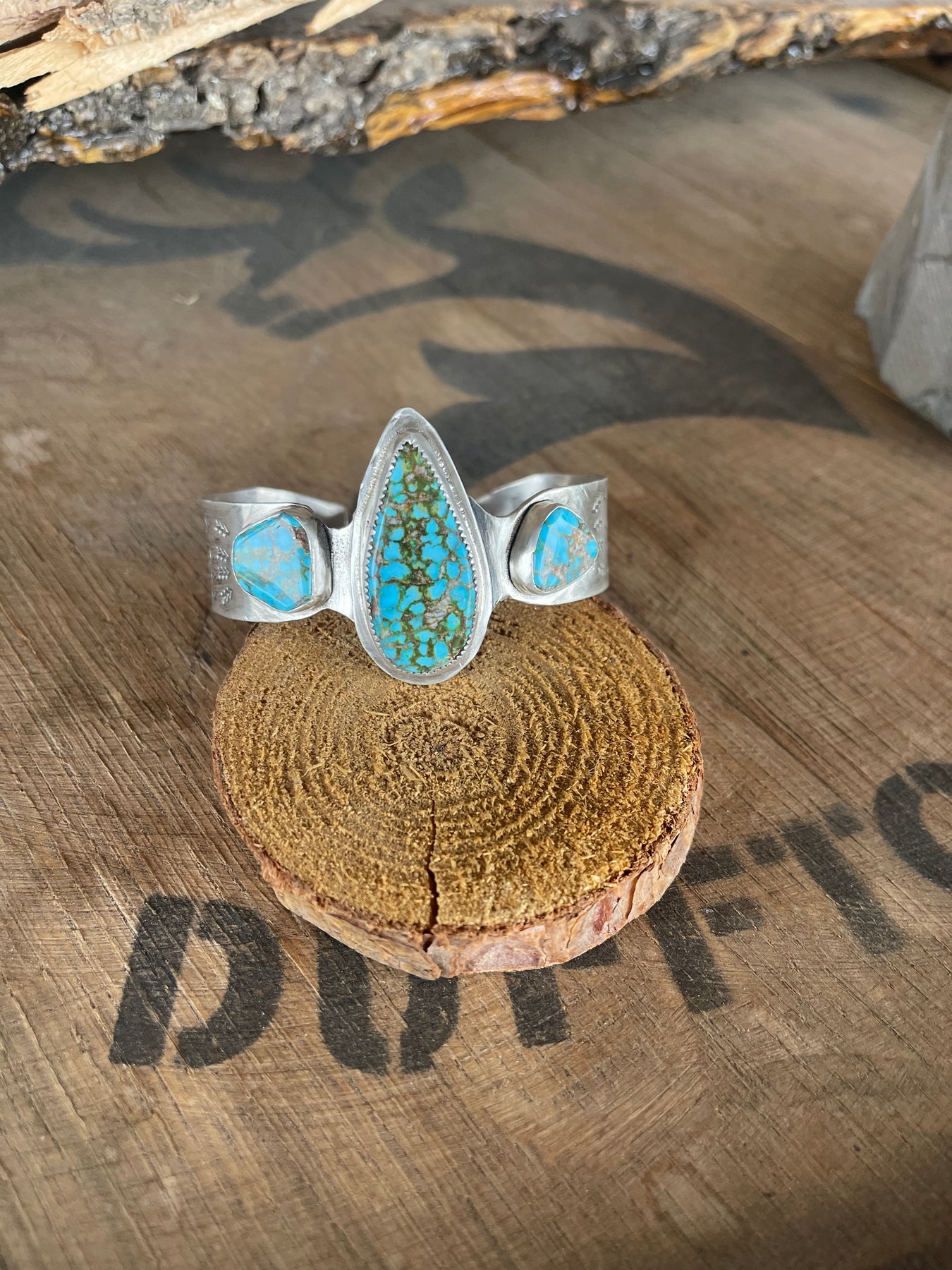 This stunning cuff features red matrix spiderweb turquoise set in sterling silver with three striking stones. The 3/4 inch wide band measures 6 inches long and showcases delicate stamped detailing, making it truly captivating.