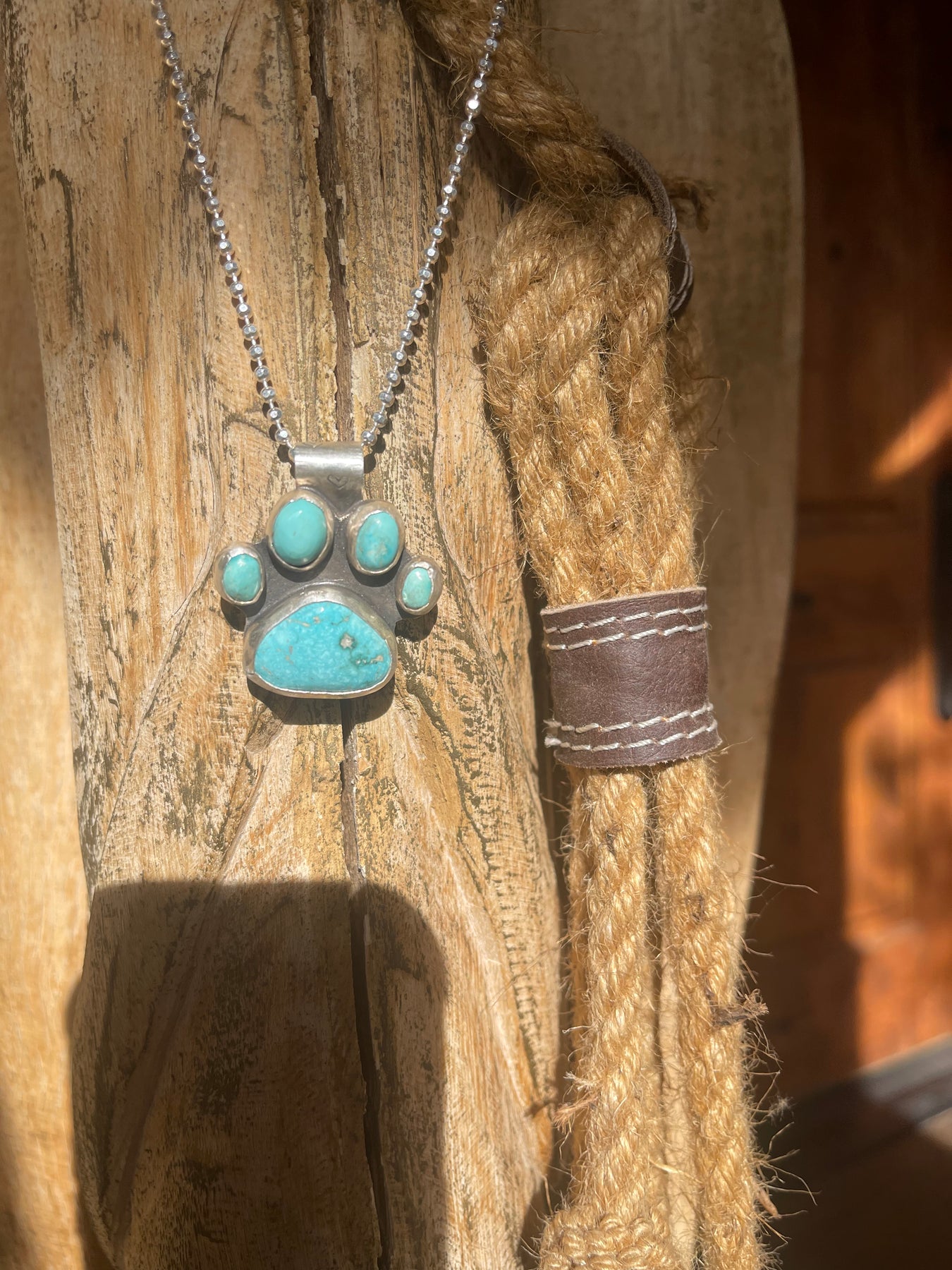This sterling silver dog paw pendant features genuine Kingman Turquoise and is paired with a braided leather chain, making it an ideal accessory for anyone who adores dogs.